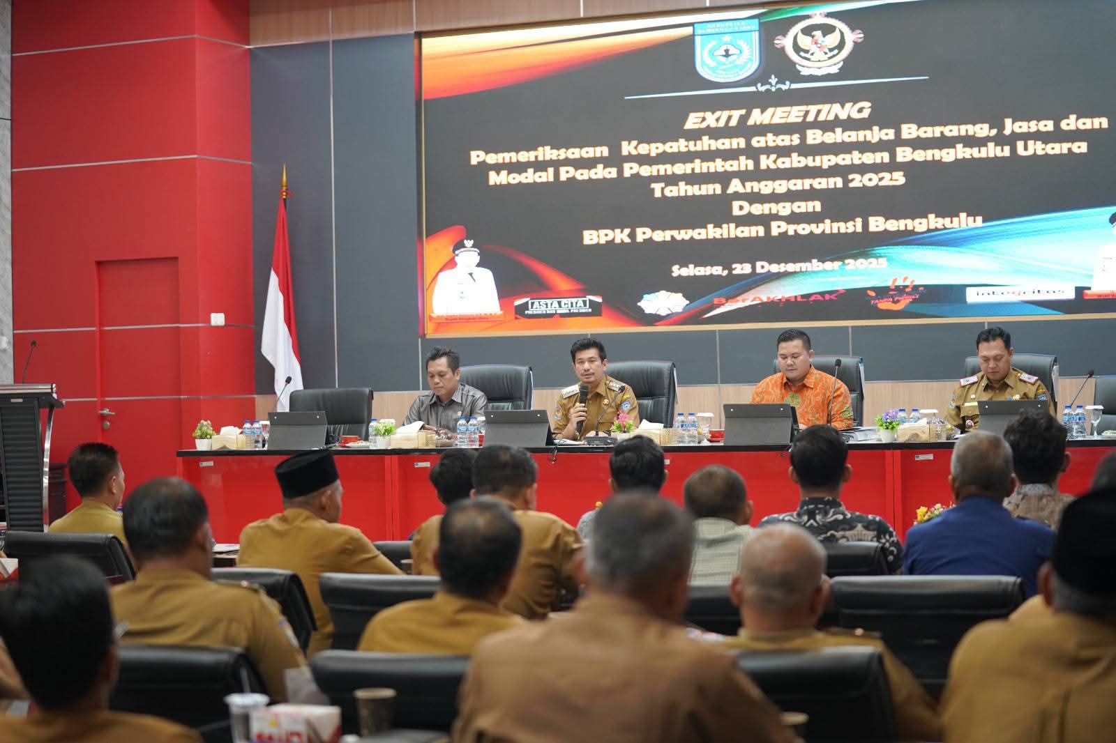 BundaranNews.com_ Pemerintah Kabupaten Bengkulu Utara menggelar Exit Meeting Pemeriksaan Kepatuhan atas Belanja Barang, Jasa, dan Belanja Modal Tahun Anggaran 2025 bersama Badan Pemeriksa Keuangan (BPK) Perwakilan Provinsi Bengkulu. Kegiatan tersebut berlangsung di Ruang Command Centre Pemkab Bengkulu Utara, Selasa, (23/12/2025).