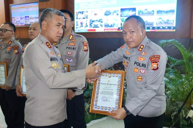 BundaranNews.com_ Kapolres Bengkulu Utara AKBP Bakti Kautsar Ali, S.Sos., S.I.K., M.H., menerima penghargaan dari Kapolda Bengkulu Irjen Pol Mardiyono atas keberhasilan memenuhi target penanaman jagung pada Triwulan I Tahun 2026 dalam program ketahanan pangan Polri, hari ini Senin (27/04/2026), bertempat di Aula Endra Dharmalaksana Bengkulu.